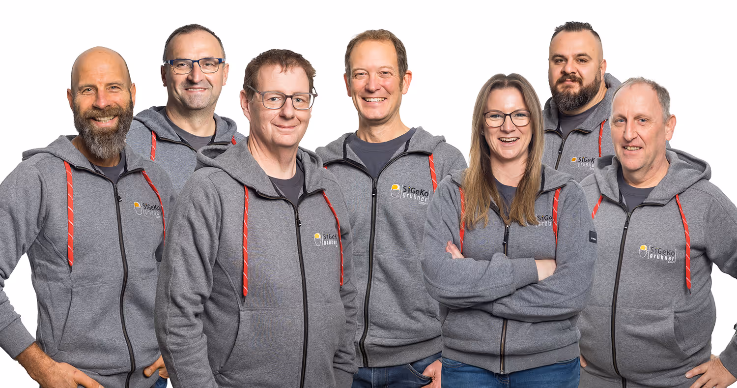 Damit Sie nicht nur unsere Namen kennen, sondern auch ein Bild dazu haben. Hier unser Team der SiGeKo Grübner GmbH